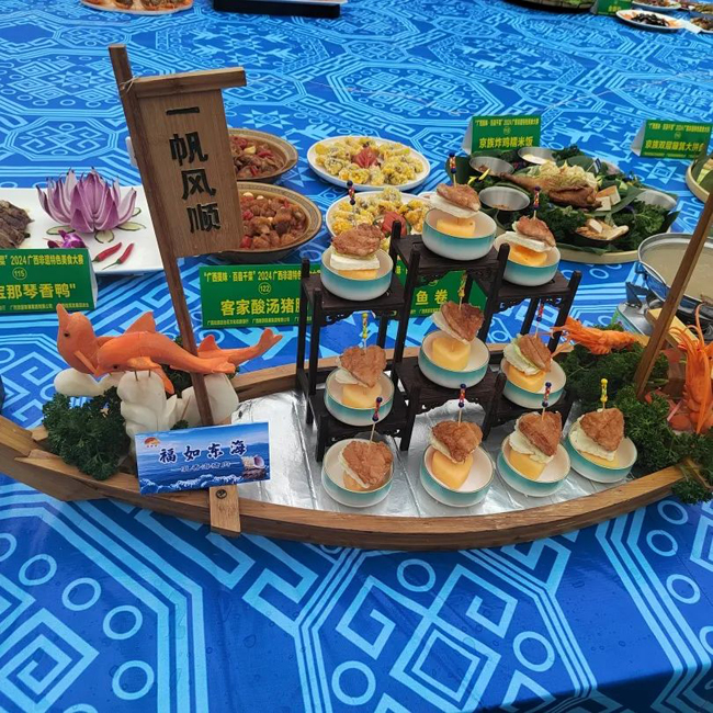 经过北海市旅游文体局积极组织发动,北海海鸭蛋、五仁金腿肉丝月饼、祖伟月饼、虾仔饼、蛋黄酥、合浦竹壳籺、沙蟹汁白切海猪肉、瓜皮醋、葱汁乳香海猪肉、炸春卷等多个北海特色非遗美食作品参赛。由疍家棚酒楼、槐园、周记海鲜大排档精心制作的14道特色菜,组成富有北海特色的“疍家迎宾宴”参加了“一城一桌菜”的展示活动。