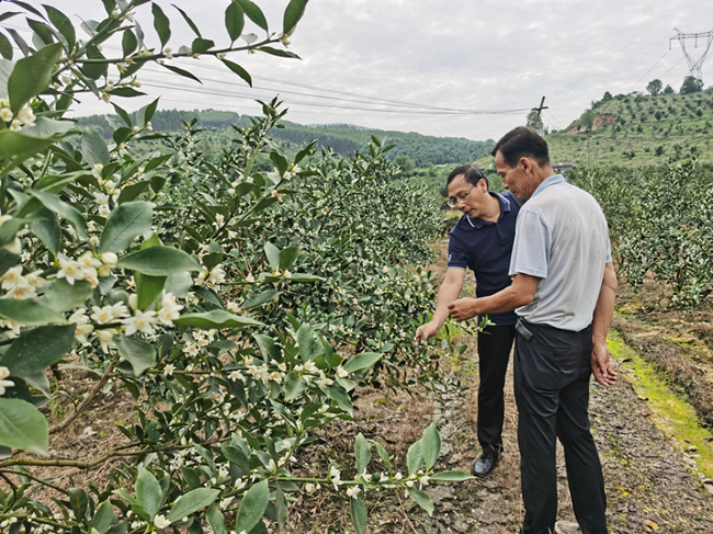 农业技术人员到垦村金桔基地指导保花保果。