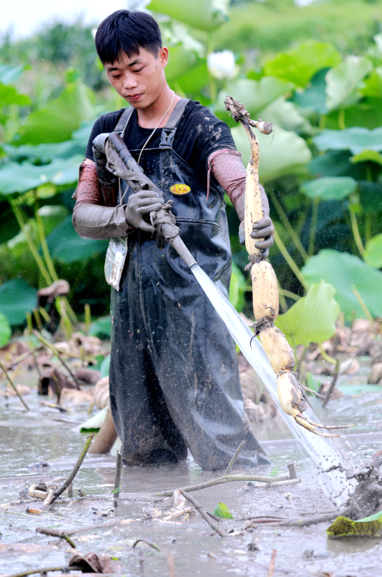 贵港市港南区桥圩镇莲藕享有盛名,种植历史悠久,是全市有名的双季藕种植基地。眼下,该镇3000多亩双季莲藕迎来了第一季的采收高峰。