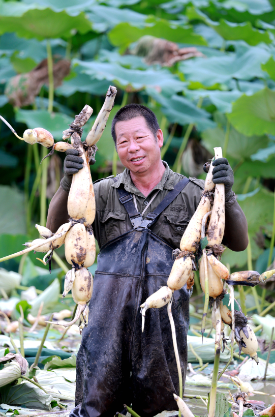 藕农谭庆初说:“我们这个早熟莲藕每年5月份开始挖,一直持续到7月份挖完,大的我们就把它拿到市场去卖,小的我们就把它当种子栽到田里。今年我家种了100多亩莲藕,根据莲藕长势预计亩产可达1000公斤,现在一天大概能采收500公斤,采收后的莲藕可集中本地销售。”