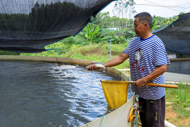 “基地在原先的基础上已经扩建至30亩,目前在用鱼池14个,主要养殖的是罗非鱼和鲈鱼。目前基地已新建好20个养鱼池准备投产,未来将计划继续扩建40个养鱼池来扩大生产规模。”李子文谈起高密度养鱼的产能和效益,鲈鱼一年能养两批,每条长至1斤左右就可以出售,目前市场集中收购价为15至17元/斤,一个养鱼池可产出8000至10000斤,产值能达12至16万元左右。整个基地年产值能达60至80万元左右。