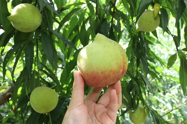 鹰嘴桃,因尾部酷似老鹰嘴巴而得名。成熟的鹰嘴桃果色鲜艳、表面光滑、果形圆润饱满、果肉肥厚鲜嫩,放嘴里嚼一嚼,清甜的汁水浸润齿间,出汁率极高,深受顾客喜爱。柳江区鹰嘴桃绿色高效栽培示范基地负责人韦国春介绍,鹰嘴桃的果皮大部分是青色的,只有受阳光直射部位才微带点红色,它不像其他桃子那样整个都是通红色的,但这并不代表桃子未成熟,泛青的鹰嘴桃依然甜美多汁、清甜爽口。