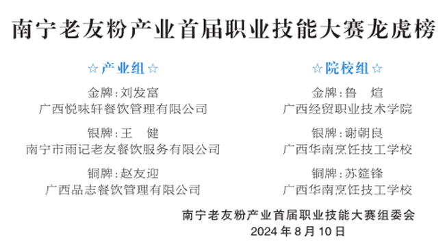 为贯彻落实南宁市委、市政府关于促进南宁老友粉产业高质量发展的工作部署,推动南宁老友粉特色美食非遗技艺传承及产业技能人才选拔培养,8月10日,南宁老友粉产业首届职业技能大赛决赛在民生广场·水漾市集举办,在预赛中脱颖而出的40名老友粉烹调高手同台竞技。经过激烈角逐,选手刘发富获得产业组金牌、鲁煊获得院校组金牌,分别捧走大师荣誉牌匾和万元奖金。当日,南宁老友粉产业技能人才培养联盟正式成立,将进一步推动产业优化升级、做大做强。