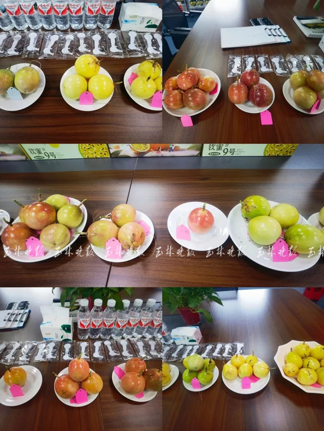 品鉴会上,工作人员将新培育的百香果新品种进行编号、整齐摆放在桌面上,提供给来自各地的领导、嘉宾、专家、百香果种植业主、百香果销售人员、喜欢吃百香果的“美食者”等一同品尝。品尝后,品尝者还分别对每个品种的味道、口感、香气、色泽等进行进行综合打分,满分为100分。大家品尝后普遍反映,这批百香果新品种甜度高、色泽好、香气浓郁。特别是香味,有10多个品种的香味鲜明,有水蜜桃香、菠萝香、柠檬香、芒果香、荔枝香等,每个品种的打分都超过85分,品鉴会圆满成功。