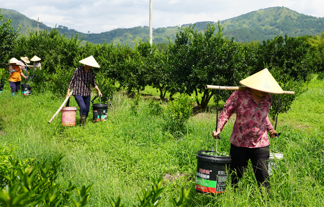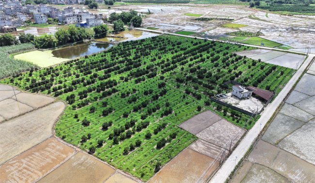 基地负责人黎超容是村里有名的种植大户,有着十几年的种植经验,原来基地种植有160多亩的砂糖橘,但由于这类水果受天气影响和市场价格波动大,2020年后黎超容开始改种陈皮柑,目前陈皮柑价格十分可观,预计年产值200多万元。