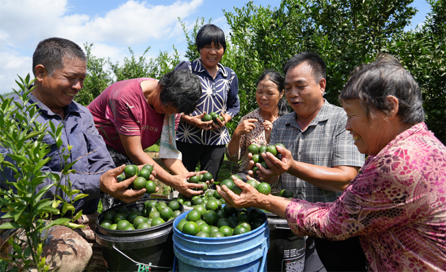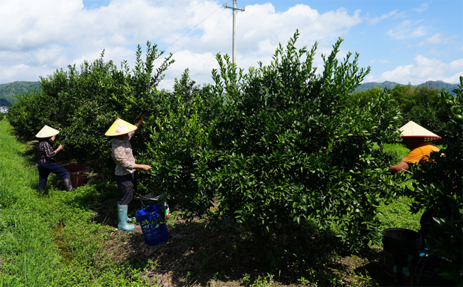 陈皮柑最宝贵的地方当属这身果皮,不仅是食品添加用的香料,还是珍贵的中药材。陈皮柑根据果实的不同阶段,有着不同的商品价值,7月-9月是摘小青柑,10月-11月摘“二红”,11月-12月摘“大红”。基地忙碌的时候用工人数100多人。