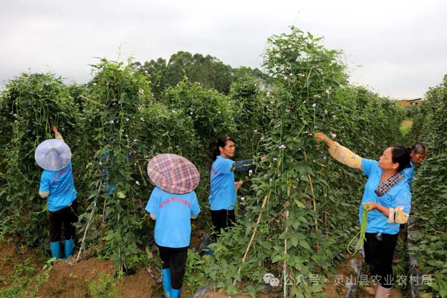 近日,广西灵山县金升农产品有限公司蔬菜种植示范基地的豇豆迎来了丰收季,一根根翠绿细长的豇豆挂满藤蔓,一片绿意盎然的丰收景象。走进基地,只见工人们脸上洋溢着丰收的喜悦,在地里来回穿梭,熟练地采摘、挑拣,一捆捆鲜嫩的豇豆整齐摞放在田边,等待客商收购。