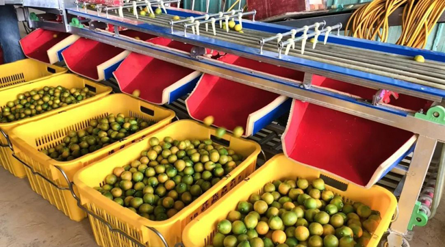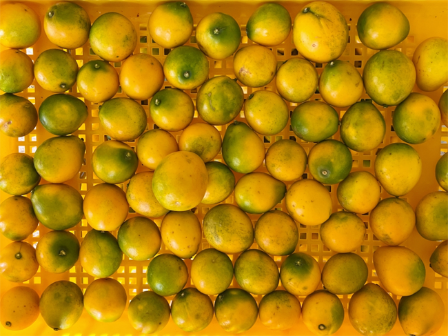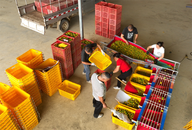 采摘好的脆蜜金桔统一送往合作社进行分拣、过称、包装,一筐筐的金桔被整齐码放着等待搬运。