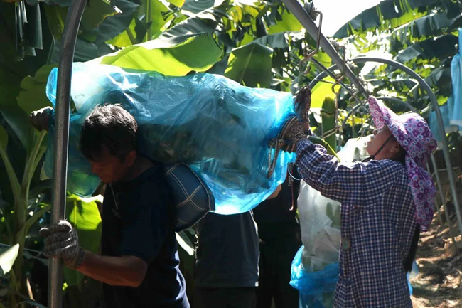 基地里,一株株香蕉树整齐排列,工人们穿行其间,发现达到收获标准的香蕉后便分工合作,一人割断香蕉树的主干,另一人则托起一整串香蕉,借坠落的势头将其扛到索道上,香蕉就会“坐”着索道来到分拣区。