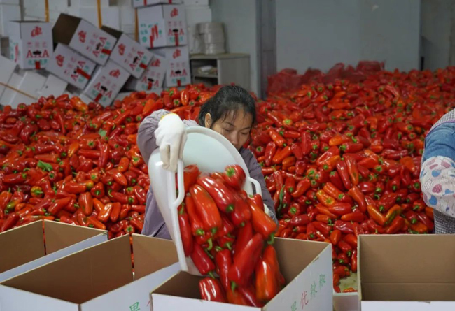 基地负责人黄洪介绍:“今年我们的甜椒采收期已经到了,平均亩产一万斤左右,现在是在装第四车了,准备发往广东,前面几车是发往东北和湖南。”