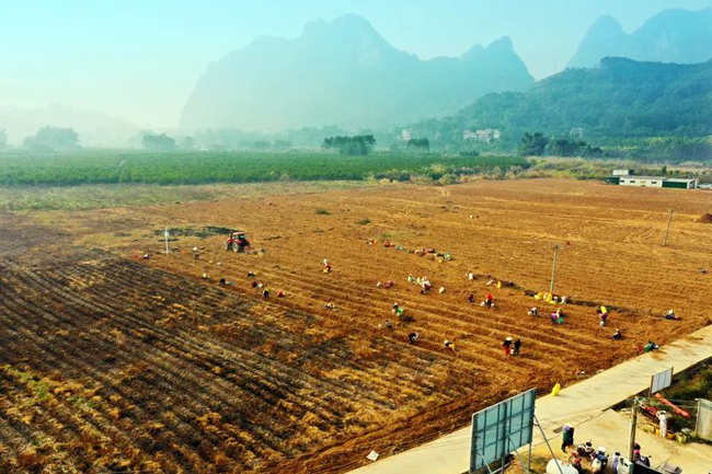 时下,正是中药材桂郁金收获的时节。在贺州市八步区莲塘镇上寺村,翻土机在田垄上来回运作,成串的长得像“土豆”般的桂郁金被翻出土面,村民手持小锄头正忙采收,在田间地头勾勒出一幅丰收画卷。