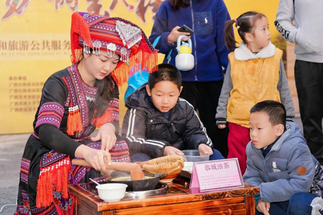 1月12日,由广西壮族自治区群众艺术馆主办的“文采飞扬 韵美八桂”2024年“赶大集”专题活动——广西文化和旅游公共服务产品展示会在南宁市隆重举行。作为桂林市的文化名片之一,恭城油茶在此次活动中大放异彩,为广大市民和游客呈现了一场极具魅力的非遗文化盛宴。