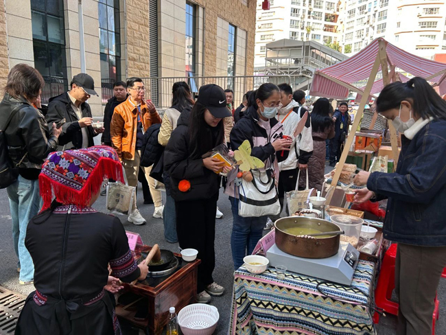 活动现场,恭城油茶摊位人头攒动,浓浓的油茶香气弥漫在空气中,吸引了众多市民驻足品尝。油茶师傅现场展示传统技艺,木槌击打出的“千年传承”与翻腾的油茶交织出热气腾腾的“人间烟火”,让观众直呼过瘾。
