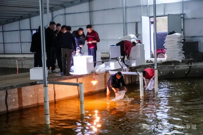 记者在养殖车间里看到,水车式增氧机24小时不停运作,工人们穿梭在各个鳗鱼养殖池间,卸货、开箱、投放鱼苗等一系列流程有条不紊地进行。一尾尾鳗鱼苗在氧气袋里被“解放”出来,欢腾地游入养殖池中。