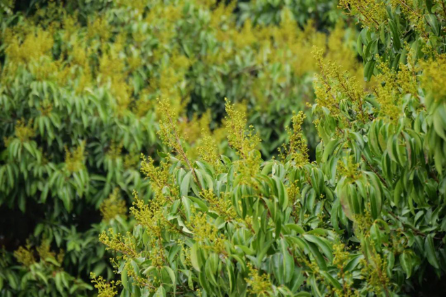 枝头密密麻麻地撑着米黄色的花穗,出花率高达九成。不时有鸟儿为这一盛况,在山间欢欣而歌。种植户们正忙着喷洒防虫护花药、修剪部分花蕾,多举措保花保果迎接荔枝丰收大年。
