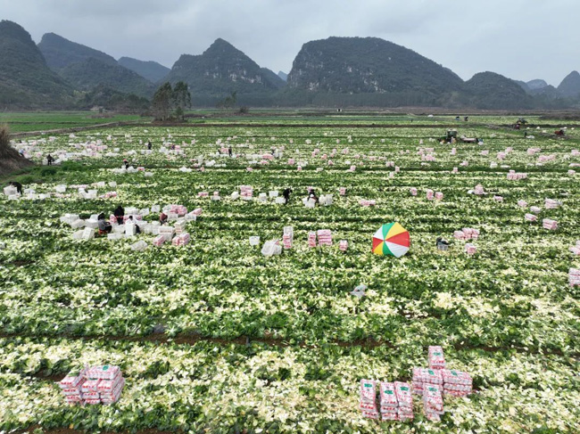 在蒙村镇乐荣村的一片蔬菜种植基地里,绿油油的娃娃菜整齐地排列着,采收的地方露出白色菜心,犹如散落的一片片白玉。工人们正忙碌地收割、分拣、打包、装车。这片菜地以种植娃娃菜为主,主要销往广东省,深受消费者喜爱。