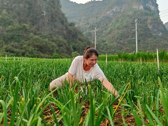 初夏的微风掠过天等县小山乡小山村龙恋屯的山坳,空气中飘散着浓郁的韭菜香。种植户梁凤爱正俯身在齐腰高的韭菜中采摘韭菜苔。