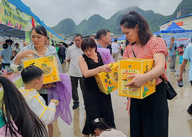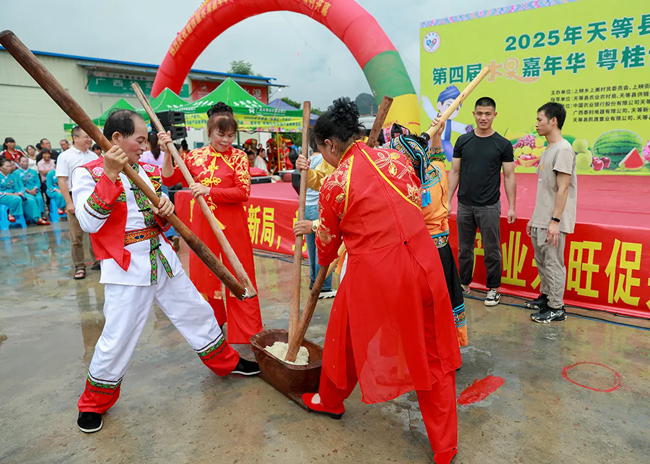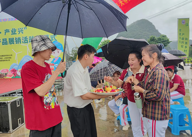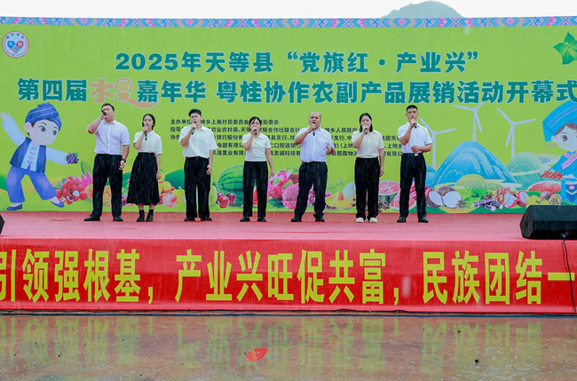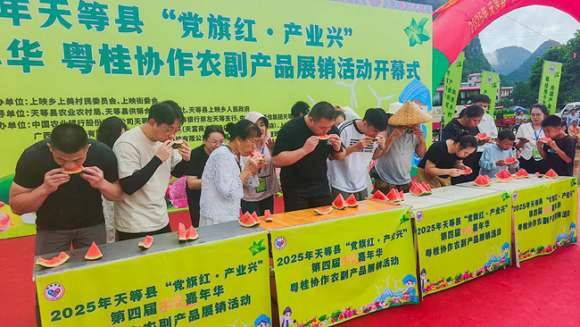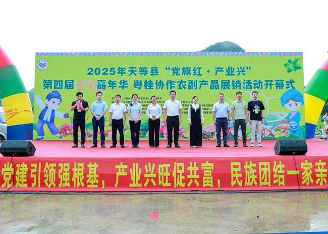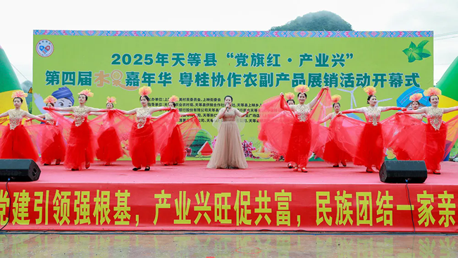 7月14日,天等县“党旗红·产业兴”第四届水果嘉年华暨粤桂协作农副产品展销活动在上映乡开幕。八方宾客齐聚,共赴这场以“果”为媒的丰收盛宴。