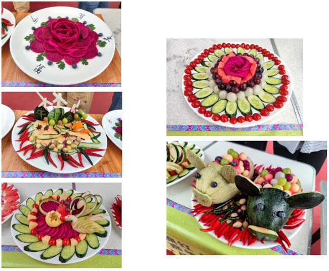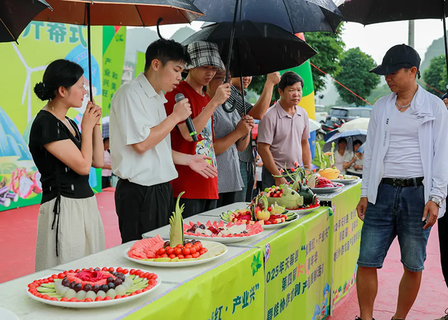 “水果拼盘”环节吸引了众多游客围观。各村代表队用本地生产的水果拼出各种精美的造型,寓意满满。其中宝贯村的“鲜果盛宴”拼盘凭借丰富的水果种类、独特的设计以及巧妙的寓意,引来游客纷纷拍照留念。