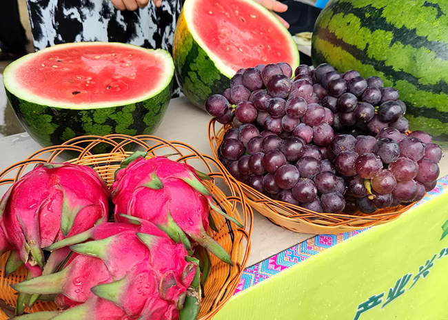 在农副产品展销区,摆满了琳琅满目的特色农产品。福赖村的腊肉、百香果,连加村的红薯、小番茄,桃永村的葡萄、桂花梨以及进远乡的韭菜花、竹笋,都康乡的坚果等应有尽有。