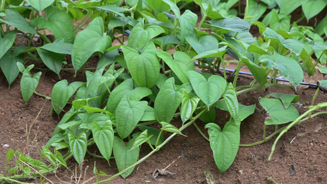 在品种选择上,卢强果断引入受到市场喜爱的“桂淮5号”这个品种第一年种植无需搭建架子,既节省了人力成本,又不影响产量。卢强提醒,连续种植的土地不能沿用此方法,因为淮山叶子易受病菌感染,必须通过搭架提升通风透光性,减少病害风险。