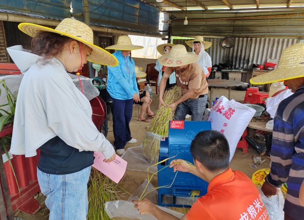 在水稻测产现场,由农业技术骨干组成的测产小组严格遵循《水稻产量测定技术规范》,围绕“精准、客观、公正”原则推进各项工作。工作人员首先对种植基地进行全面勘察,结合地块肥力、水稻长势等情况,科学选取3个具有代表性的样方;随后,使用专业收制设备对样方进行规范收割,避免因操作不当影响产量数据;收割完成后,依次开展脱粒、人工除杂、水分检测、称重计量等环节全程做好数据记录与核对,确保每一组数据真实可靠。