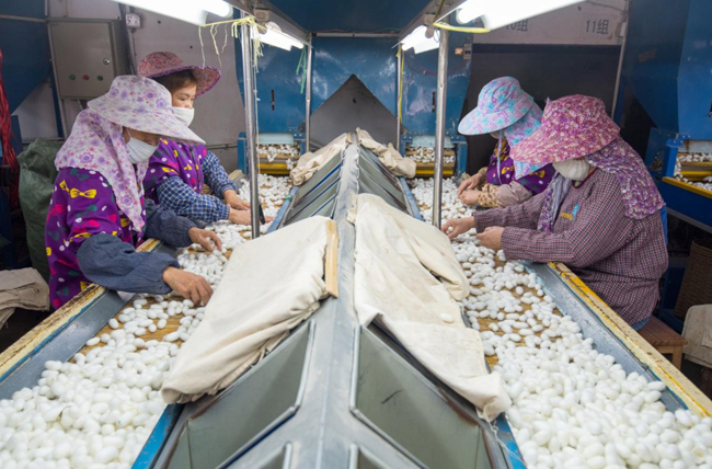图为东方丝路公司选茧车间生产场景。