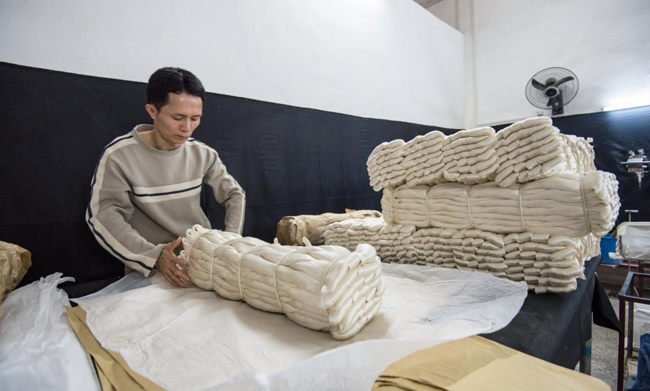 图为东方丝路公司生丝包装车间工人在包装产品。