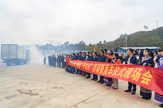 活动启动后,发车仪式现场一派繁忙,果农忙着运送、售卖沙糖桔,外地客商专注于打包、装车,喜庆的鞭炮声与轰鸣的彩炮声交织。满载黄灿灿沙糖桔的车辆缓缓驶出广西西林泰源果业开发有限公司,奔赴北京、沈阳、新疆乌鲁木齐等全国多地。据广西西林泰源果业开发有限公司董事长刘建军介绍,开市当日共发出12车沙糖桔,总计240吨。