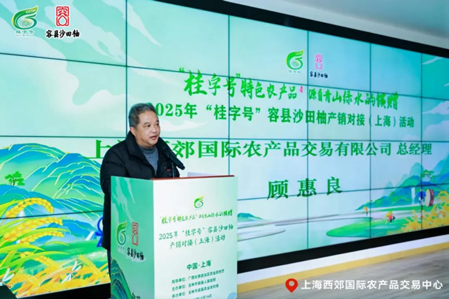 上海西郊国际农产品交易有限公司总经理顾惠良介绍西郊国际在蔬菜和国产品牌交易中的关键角色,将推动外省优质农产品入沪,旨在通过西郊国际平台深化农业合作,促进容县沙田柚等优质农产品流通,搭建高效产销对接平台,期待两地深入合作,共同提升乡村振兴和城市消费品质。