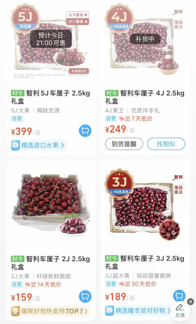 此外,在线上各大买菜平台上,各个等级的车厘子都在热销中,不少等级还出现了断货现象。