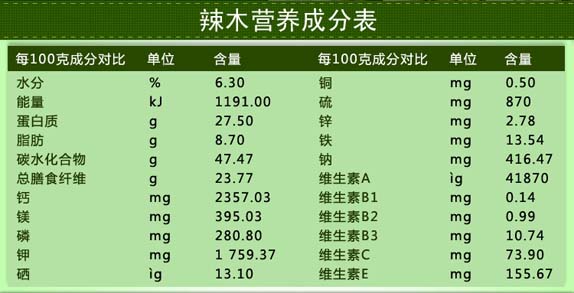 经中国农业部蔬菜品质监督检验测试中心测定证明,每100g的辣木叶片中含有蛋白质27.1克,约为牛奶的2倍;含维生素C 200毫克,约为鲜橙的7倍;含维生素A 16.3毫克,约为胡萝卜的4倍;含铁28.2毫克,约为波菜的3倍;含钙2003毫克,约为牛奶的4倍;含钾1324毫克,约为香蕉的3倍,钾、铁、镁等含量都高于其他蔬菜、水果等。