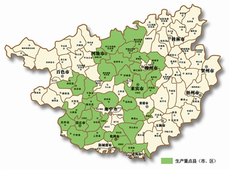 广西糖料蔗生产重点县(市、区)分布图