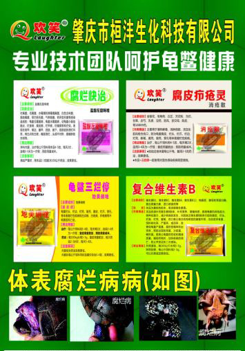 病症:病龟头、颈、四肢及尾部出现烂坏死,有的裂壳、穿孔,有的脚爪脱落,背甲和腹甲的盾片出现腐烂,初期盾片接合部呈黑色腐烂状并还逐步出现盾片浅层皮脱落,严重时,相邻盾片接合部烂至深层,用手能挤压出脓血,腹甲盾片得腐烂症状比背甲明显。病龟消瘦,食欲减退,停于饲料台不动,最后死亡。