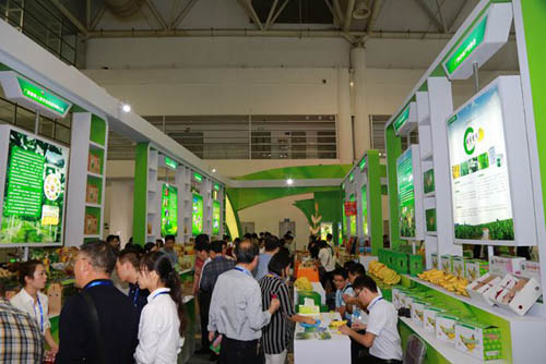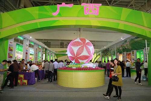 第十三届中国国际农产品交易会广西馆位于福州市海峡国际会展中心2号展馆,本次农交会广西馆占地面积360平方米,展位30个,参展企业30家。经过两天的紧张搭建和展品布置,广西馆于11月7日上午清新亮相。铜鼓、绣球,两大富有广西壮族特色的装饰让观众一目了然,约5000块用火龙果做的玛卡龙为绣球穿上了漂亮的外衣,加上灯光的变幻,整个展馆变得光彩夺目。展馆的主打色调为绿色的,代表广西农产品有机、生态、健康,虽然展馆占地面积不大,但一亮相,广西独特的装饰以及特色的农产品很快便吸引来了非常多的观众。