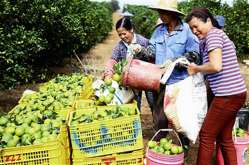 11月3日,龙州先锋农场内,果农正在采收红江橙。