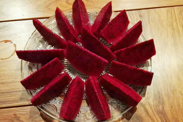6、火龙果果实汁多味清甜、除鲜食外、还可酿酒、制罐头、果酱等。花可干制成菜、颜色可提炼食用色素。
