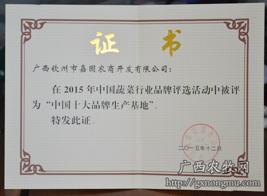 钦州市嘉园农商开发有限公司在大会上获“中国十大品牌生产基地”殊荣