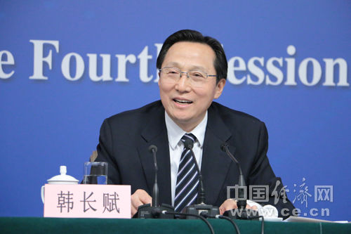 3月7日(星期一)上午10时45分在梅地亚中心多功能厅举行记者会,由农业部部长韩长赋、新闻发言人叶贞琴就“转方式调结构 加快发展现代农业”的相关问题回答中外记者的提问。图为农业部部长韩长赋。中国经济网记者李方/摄