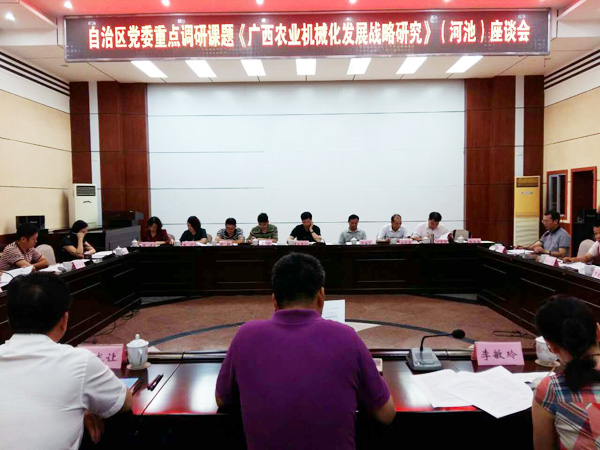 河池市委书记何辛幸,市委常委、副市长李建设,市政协副主席、民盟河池市主委陈健,以及市农业局、农机局、市科技局、市财政局、广西日风农业科技有限公司等单位领导,与调研组座谈,与会者积极发言,反映河池农机现状,为当地农业机械化的发展献计献策。
