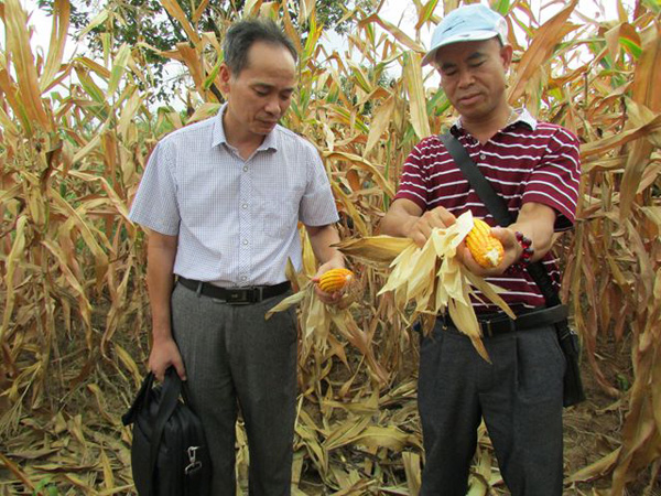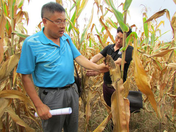 专家查看试验区玉米为害损失情况