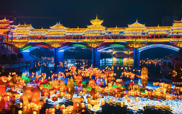 满江的河灯与江面的风雨桥交相辉映