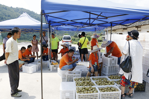 图为家宝农业联合社的工作人员在基地收购红心猕猴桃
