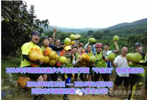 由天峨县六美生态农业休闲园有限公司主办,岜暮乡人民政府、天峨县旅游局、天峨县文广新体局等相关部门协办的2016年天峨县岜暮乡六美金柚节暨“牛魔王”争霸赛将于2016年9月24日至10月9日在天峨县六美生态园举行。该活动旨在推进天峨沙田柚现代农业核心区的创建工作,提升天峨县三特水果知名度,大力发展生态休闲旅游业,宣传推介天峨县民俗文化,打造天峨生态文化旅游品牌,实现旅游产业扶贫致富目标。
