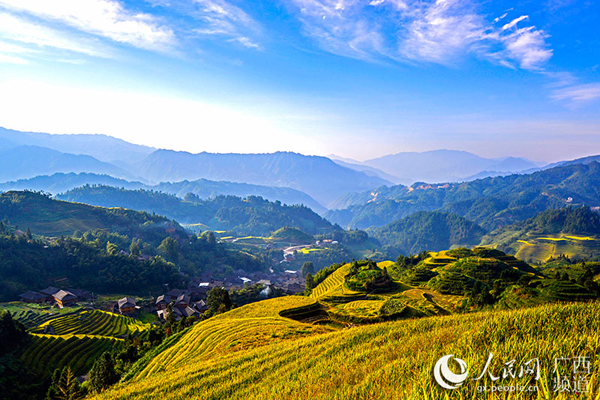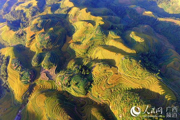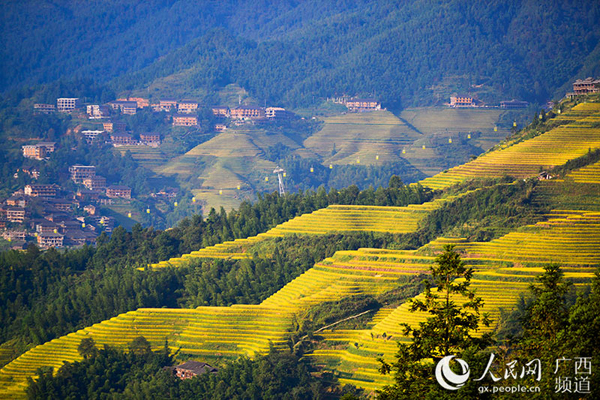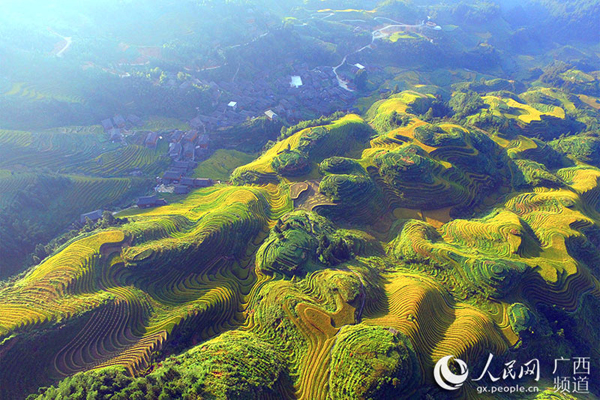 秋分时节,广西桂林市龙胜各族自治县各村寨的梯田稻浪滚滚,层层叠叠,像一座座“金塔”,从高空俯瞰,犹如“大地染金”,美不胜收。