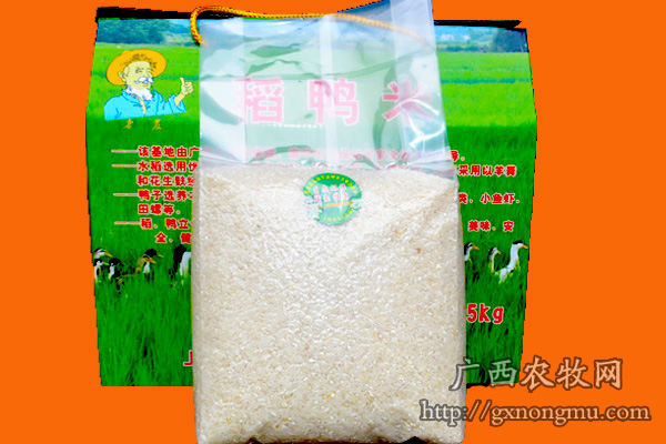 上林县老农原生态种养合作社基地选用上林本地优质水稻品种,不施化肥、不喯农药激素,全部采用以羊粪、牛粪和花生麸经充分发酵形成的有机肥,鸭子选用本地杂交水鸭,不喂饲料(喂煮熟的玉米),稻田自由放养,吃害虫、小鱼、虾、田螺等,稻鸭立体种养、优势互补,稻谷和水鸭天然、绿色、美味、安全,稻鸭米是上林大米在品质上的又一大提升。