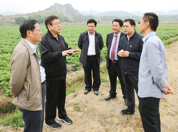 自治区党委常委、玉林市委书记王凯(左二)、市长苏海棠(左一)、副书记李常官(右二)在玉林市农业委员会主任陈运桥(左三)的陪同下,在北流市塘岸镇金城村广西昊华农业有限公司冬种马铃薯高产示范基地调研。