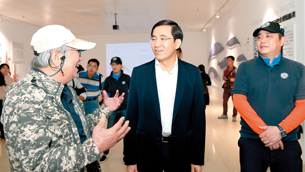 黄海昆(中)、潘文石(左一)共同参观中华白海豚科普馆。 钦州日报记者 赵冠雄 摄