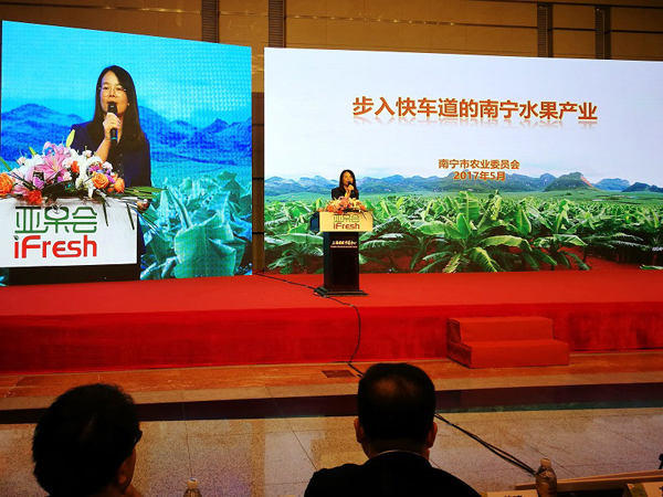 为了进一步打响南宁水果品牌,市农委欧桂兰总农艺师出席本次大会,并在大会上推介“南宁水果产业”,重点介绍了南宁特色优势水果:香蕉、火龙果、晚熟柑橘等水果产业发展情况。中国正在实施一带一路战略,建设中国东盟自由贸易区,在南宁市委、市政府的高度重视和大力扶持下,南宁水果产业有广阔的发展空间,南宁特色优势水果品牌将家喻户晓,品牌影响力进一步提升。