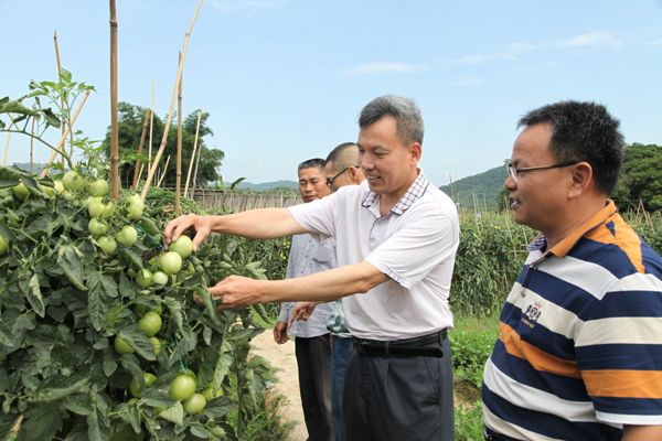 方建安首先来到“钦州市壮族民族团结示范点”——钦北区那蒙镇平福村检查“菜篮子”基地生产情况。在果实累累的西红柿竹架旁,方建安与农户、当地干部亲切交谈,了解西红柿的生产销售情况。据了解,在市农业技术推广中心和当地农业站农技人员 “一对一” 的技术帮扶指导下,种植户科学选种,提前施足基肥、合理追施氮磷钾,病虫防控得当。目前,平福村的100多亩西红柿长势良好,正源源不断地采摘上市,每天供应钦州市场超过两万斤。据种植户介绍,照现在的长势,亩产量预计超过5000公斤,按现在批发价每公斤3.6元计算,亩产值超过1.8万元。方建安指出,各级农业部门要以市场需求为导向,因地制宜指导农民大力发展优势经济作物,通过合理化布局、标准化生产、产业化经营和制度化监管等措施,有效提升全市蔬菜供给水平,保障群众“餐桌安全”。